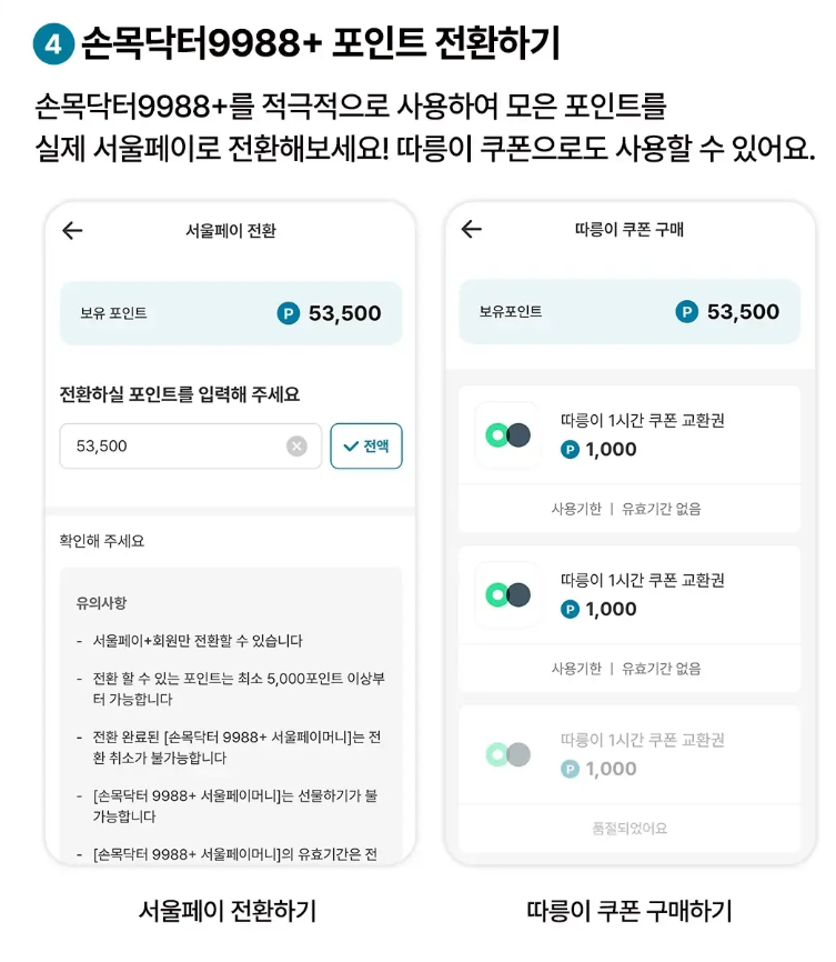 - 부족한 포인트는 서울페이 상품권(손목닥터9988 워치상품권, 서울사랑상품권(광역))으로 보충 가능